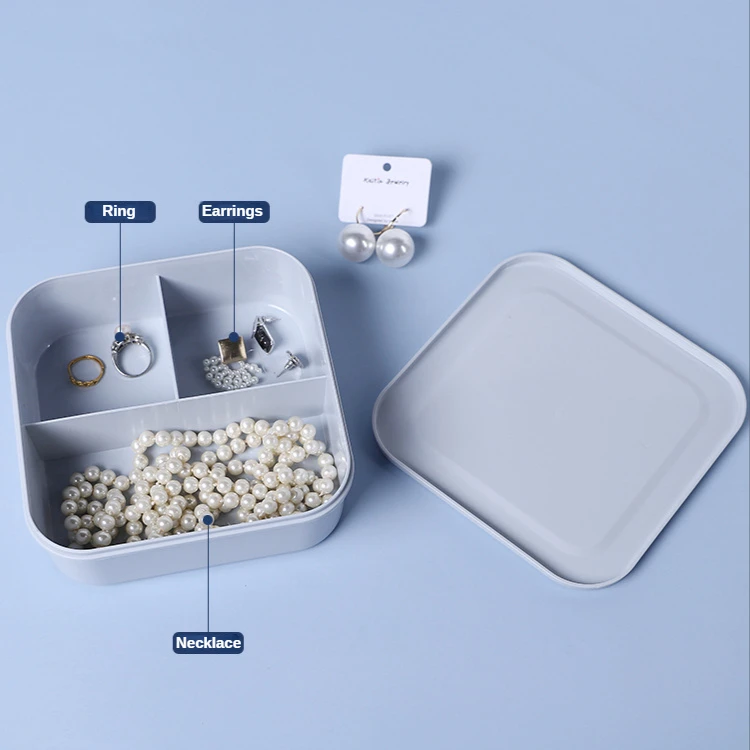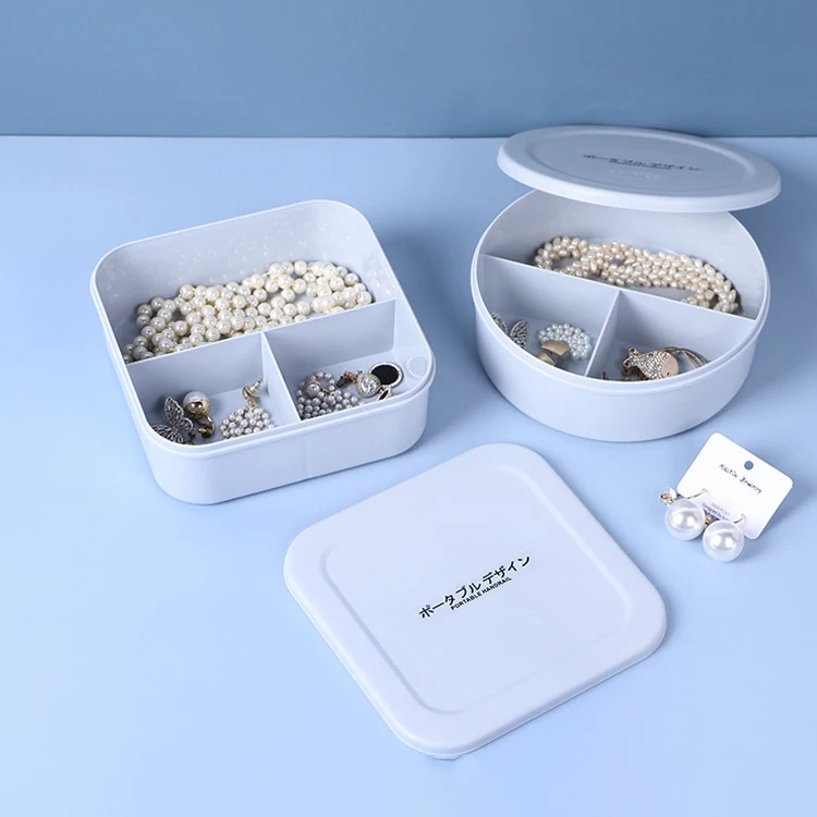 This versatile jewelry storage box is the perfect solution for keeping your precious accessories organized while traveling or at home. Crafted from durable plastic with multiple compartments, it efficiently stores rings, earrings, studs, necklaces, and other delicate pieces to prevent tangling and scratches. The compact design makes it ideal for travel, fitting easily into luggage or handbags, while the secure closure ensures your jewelry stays safely in place. Each compartment is thoughtfully sized to accommodate different types of jewelry, making it simple to locate and access your favorite pieces. Whether you're a frequent traveler or simply need a practical way to organize your jewelry collection, this clear storage case offers both functionality and convenience. The transparent lid allows you to quickly identify contents without opening the box, making it an essential accessory for any jewelry enthusiast.